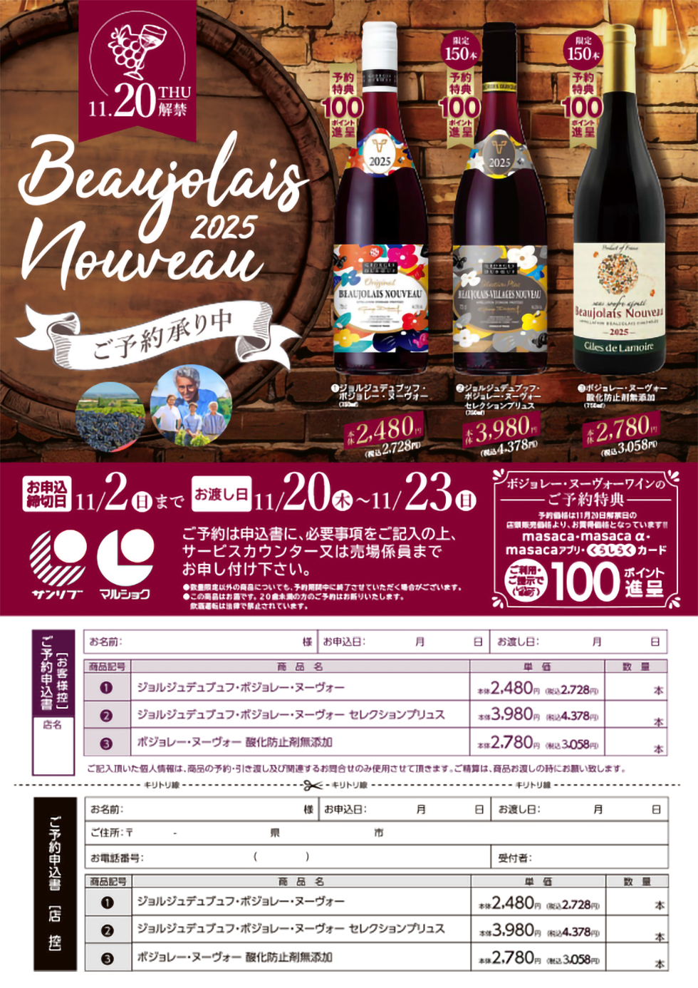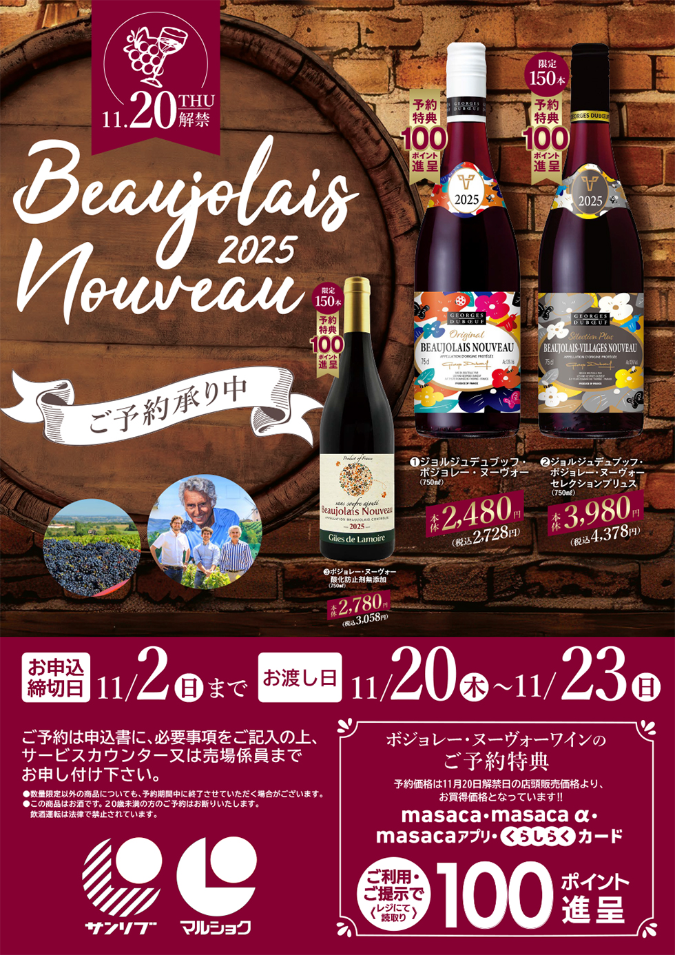 ご予約は裏面の申込書に、必要事項をご記入の上、サービスカウンター又は売場係員までお申し付け下さい。●数量限定以外の商品についても、予約期間中に終了させていただく場合がございます。●この商品はお酒です。20歳未満の方のご予約はお断りいたします。飲酒運転は法律で禁止されています。