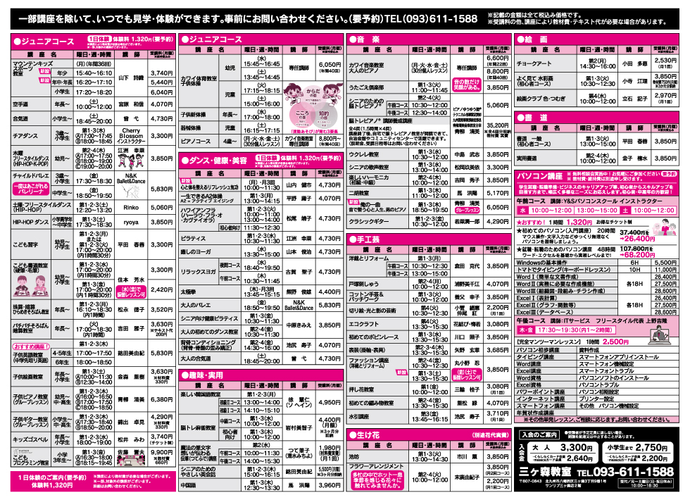 一部講座を除いていつでも見学・体験ができます。(事前にご予約を) お問い合わせ先:三ヶ森店 文化サークル TEL 093-611-1588 *受講料の他、講座により教材費・テキスト代が必要な場合があります。